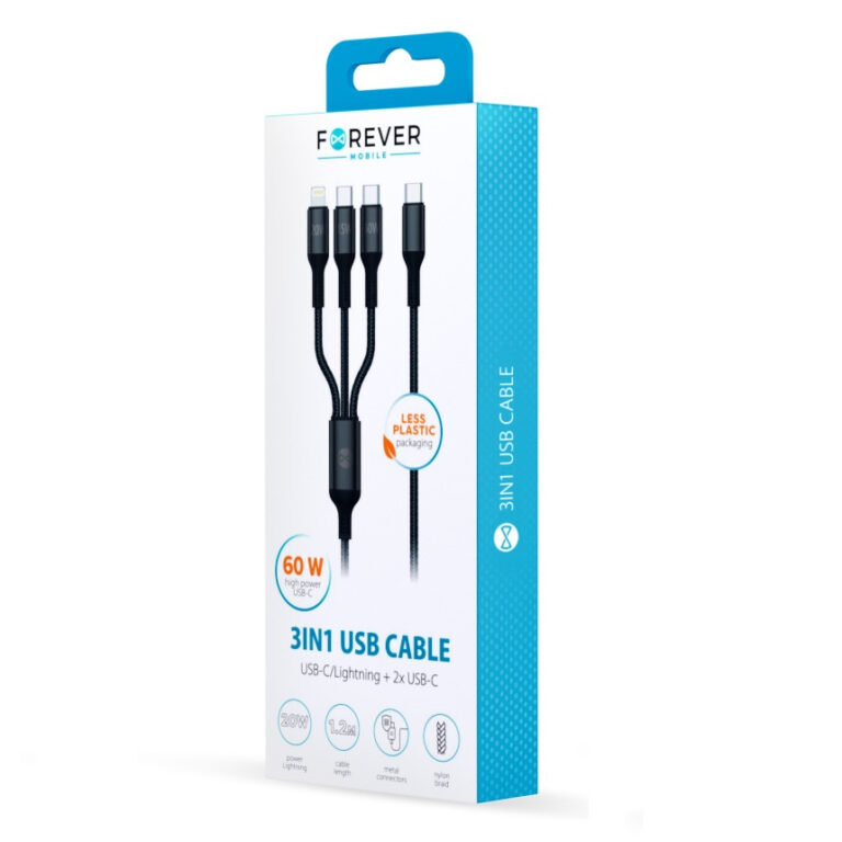 Câble de Charge et Synchro 3 en 1 USB-C/Light+2xUSB-C – 1.2m 60w – Forever