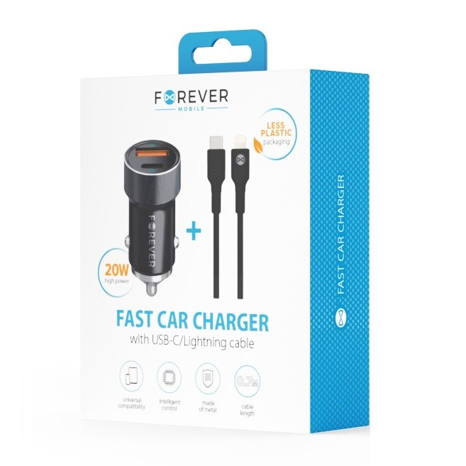 Chargeur auto 1xUSB 1xUSB-C + Câble USB-C Lightning – 20W – Forever