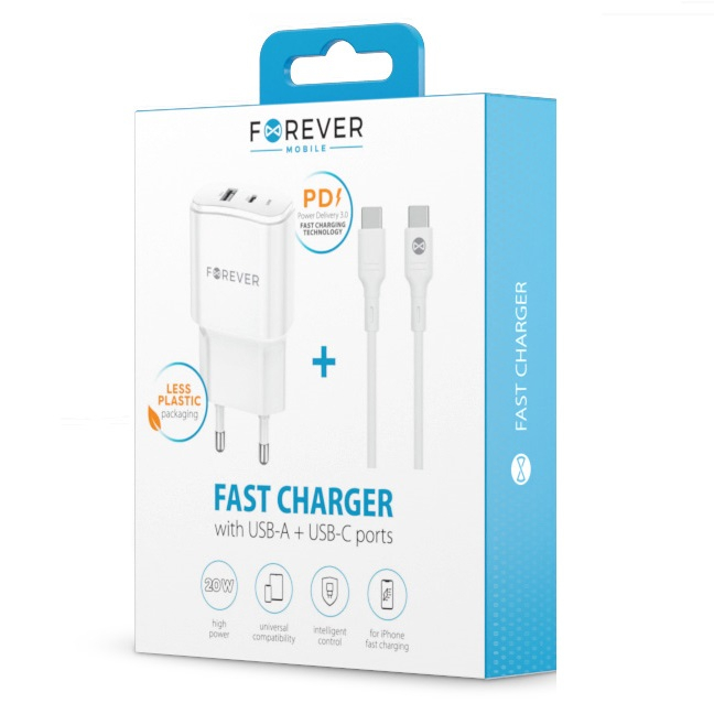 Chargeur secteur 1xUSB 1xUSB-C + Câble USB-C USB-C – 20W – Forever
